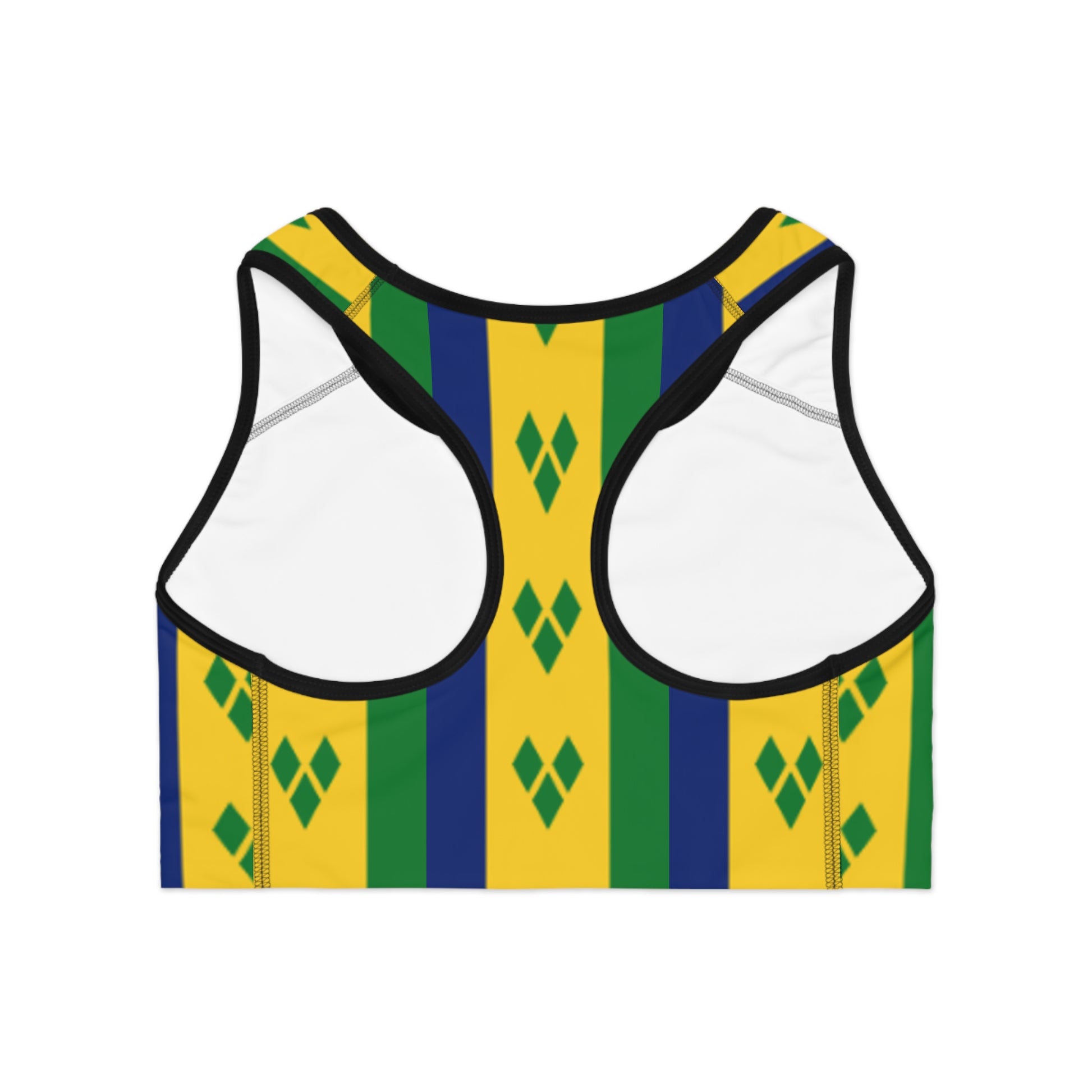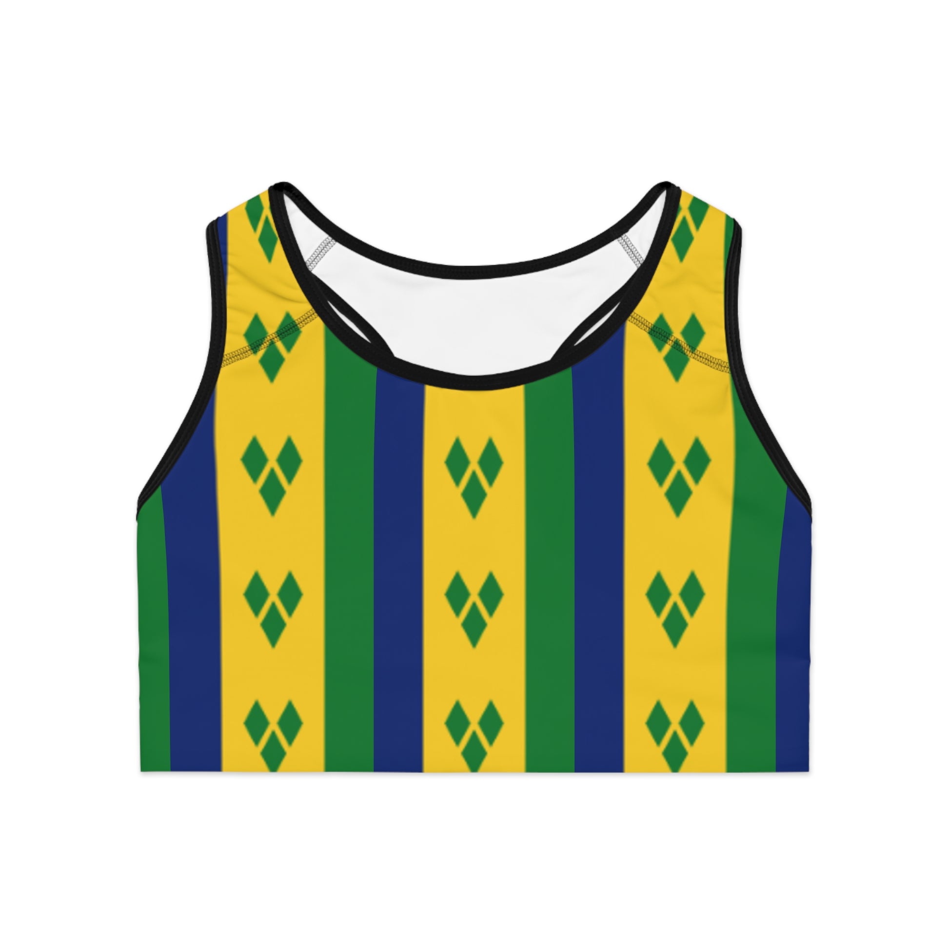 Introducing our vibrant St Vincent & G Sports Bra, designed for the active lifestyle. This piece offers a perfect blend of style and functionality. With its colorful all-over print, it ensures you stand out during your workouts or casual outings or even Carnival. Feel confident and comfortable whether you're hitting the gym, going for a run, or enjoying a yoga session.